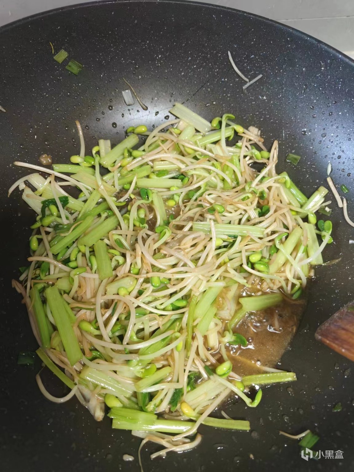 刷乾淨三天沒洗的鍋,倒入花生油,待油溫上升到三層樓高的時候放入蒜末熗鍋,然後放入切好的毛芹菜和豆芽,翻炒兩下放入生抽,雞精,味極鮮,耗油,食鹽,快速翻炒,炒至變色段生即可,從鍋中盛出放入碗底備用