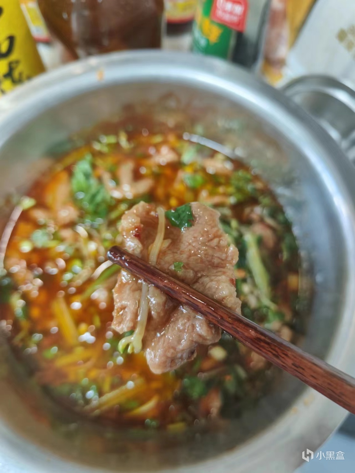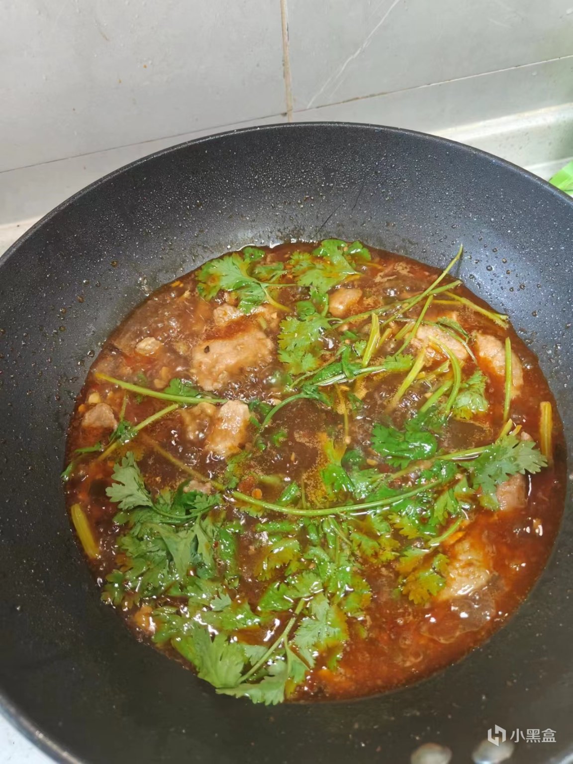 拿出冰箱裏的肉,逐片放入鍋中,放入的所有的肉片後不要攪動,輕輕推鍋,讓肉片慢慢移動防止粘鍋,然後再倒入一點澱粉水收汁,待肉片變色後放入一把香菜,最後將所有的湯和肉倒入豆芽芹菜託底的碗裏