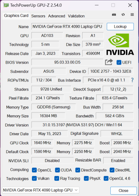 本機顯卡顯卡搭載的是一顆GeForce RTX 4090筆記本電腦GPU,並且7945HX3D版本的機器機器目前只有搭載4090顯卡的SKU,其擁有9728個CUDA核心,以及256bit位寬的16GB DDR6顯存,並且本機支持雙顯卡三模切換,可以根據情況自由設置集顯模式,獨顯直連和混合模式: