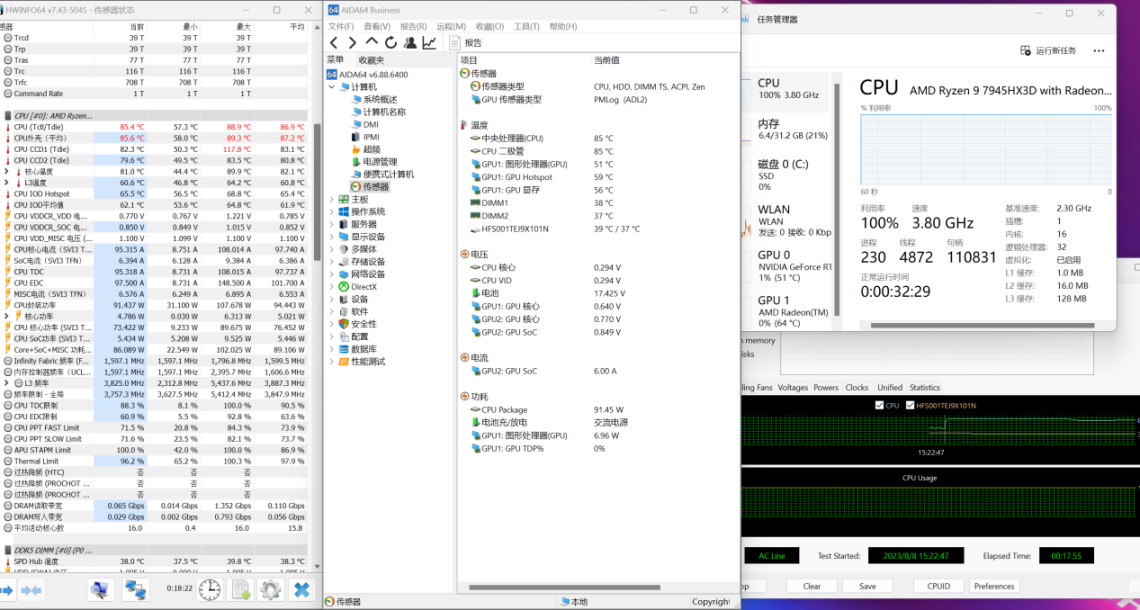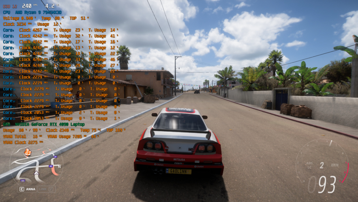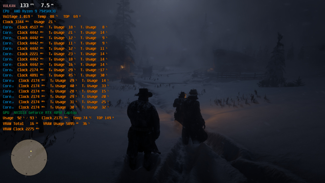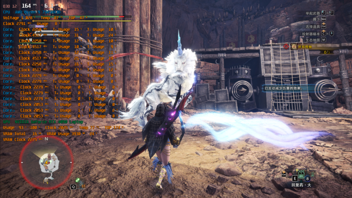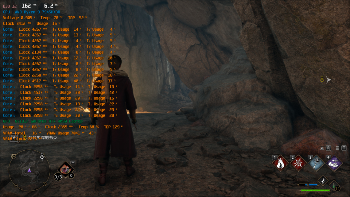 特效預設:超高, DLSS:自動,2.5K全屏,垂直同步關,基本全程可以頂着240Hz的屏幕刷新率跑,加上17.3的16:9大屏,玩這類遊戲沉浸感拉滿。玩這個遊戲朋友估計比較瞭解,這遊戲第一次進入的時候加載賊慢,需要預讀取大量信息,然而這個問題在這顆79453D上就不在是問題。通過垂直3D緩存堆疊技術,大大提升L3緩存的容量的信息交換速度,L2+L3總計高達144MB的超大緩存讓遊戲加載變的賊快,全大核的核心配置也讓它面對這類遊戲顯得遊刃有餘,佔用僅12%左右,壓力相當低。