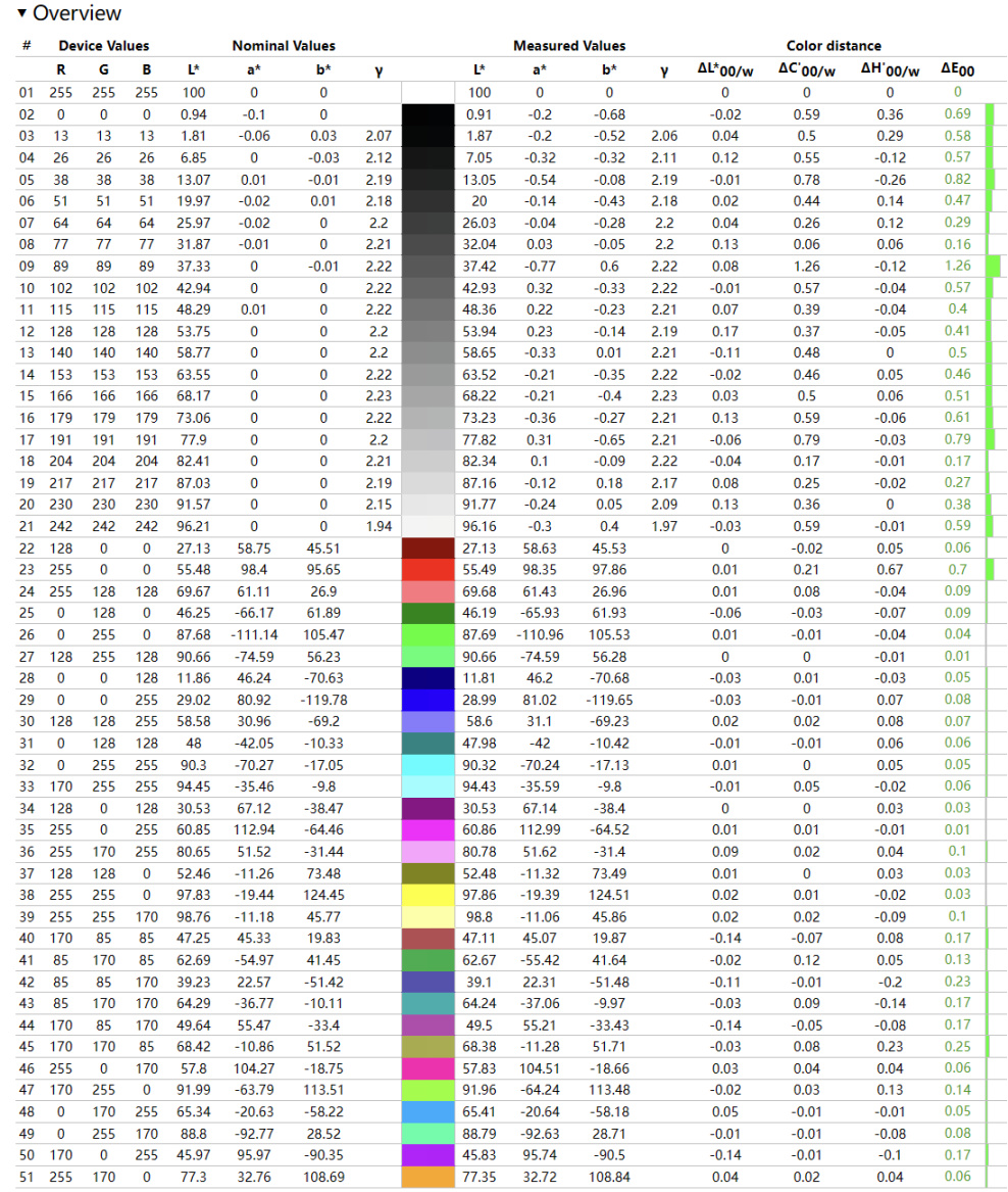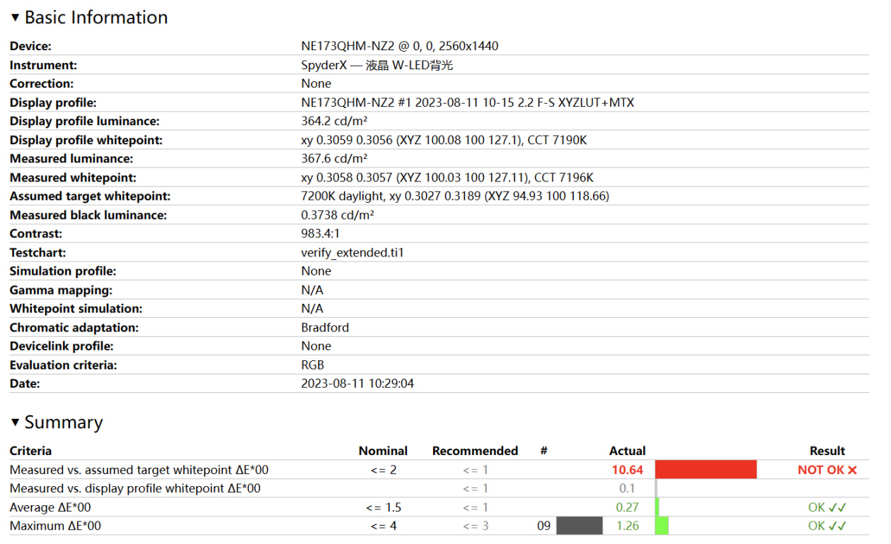 最大亮度爲367nit,經過校準後平均ΔE*00僅有0.27,色準處於一個相當出色的水平: