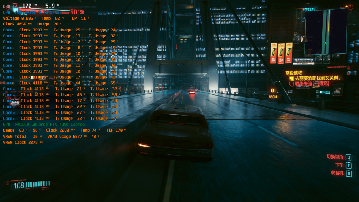 特效預設:超級,DLSS:自動,渲染精度0.5,在2.5K原生分辨率全屏模式下,不管是路上開車還是街道里打架,FPS大概在150-170左右徘徊,頭一回在移動端平臺上見到2077過百幀: