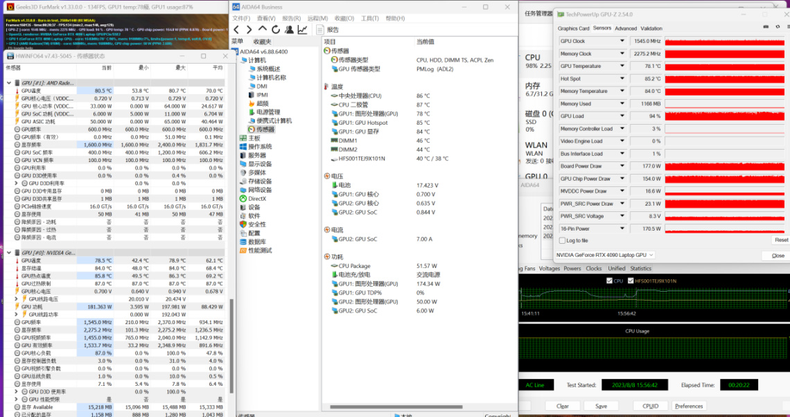 雙烤方面最終可以穩定在51W+180W左右的程度,顯卡可以喫滿加速功耗,整機最大性能釋放在230W多點的樣子,和官方標的235W出入不大: