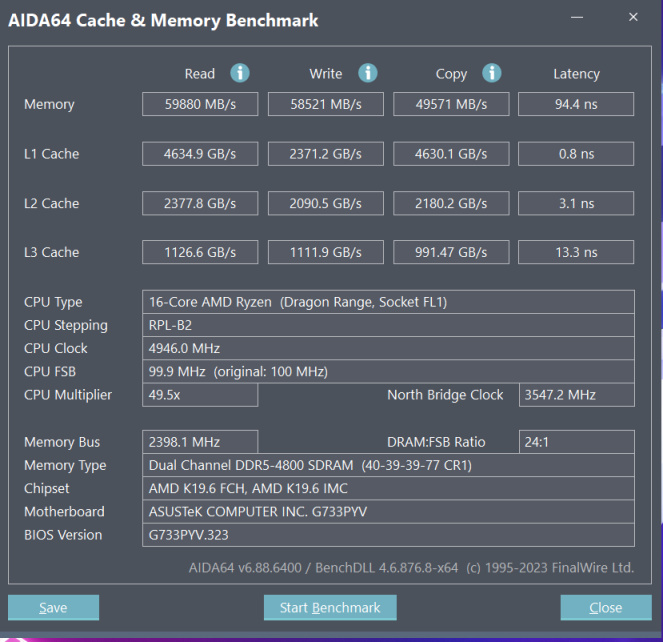 雙16G DDR5 4800MHz,讀取高達59880MB/S,面對一些比較喫大內存的遊戲和應用變得遊刃有餘,符合頂級遊戲本該有的水平,沒啥毛病: