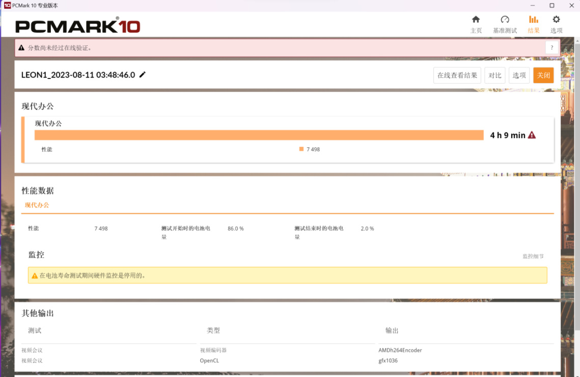 續航方面,本機搭載了一顆90wh的電池,實測在屏幕一半亮度,集顯模式,連接WIFI的情況下,在PC Mark10的現代辦公續航測試中,電量充86%-2%耗時4h9min: