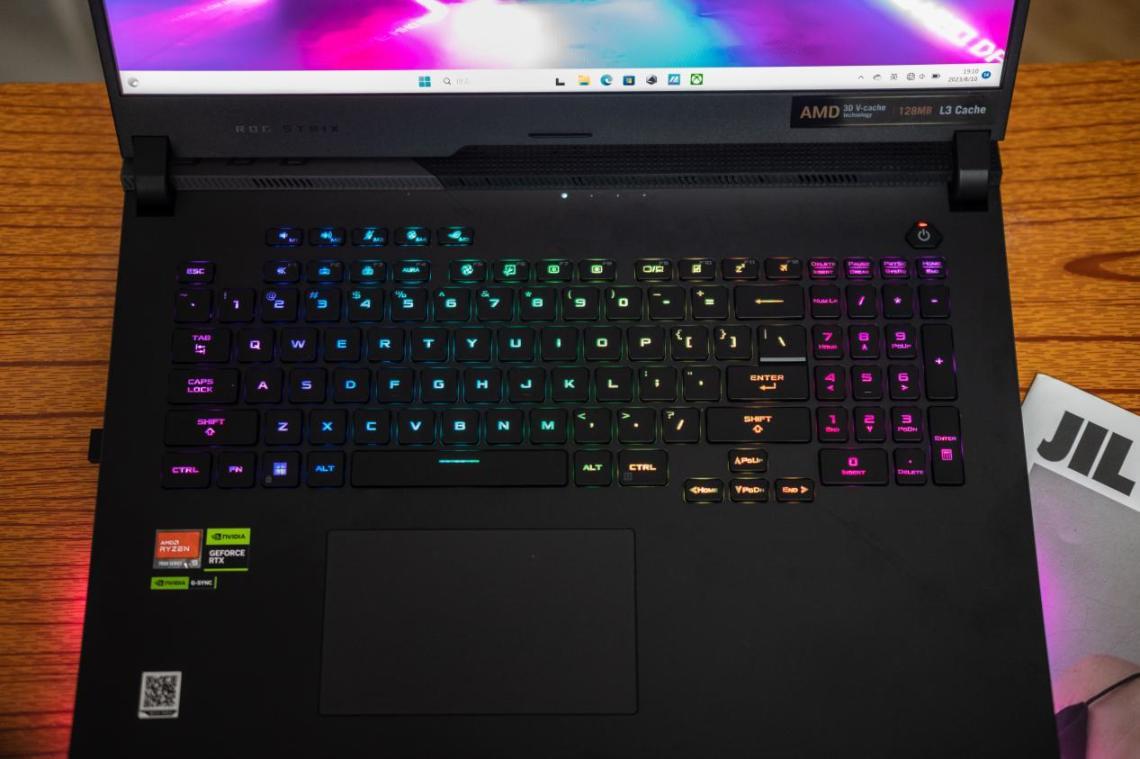 整機做工相當紮實,符合機器的定位,雖然和常規版本的魔霸7 Plus超能版外觀上區別不大,但是屏幕右下方3D-Cache貼紙宣誓着機器擁有一顆更強的心臟。單鍵RGB和U型氛圍燈同樣是信仰拉滿: