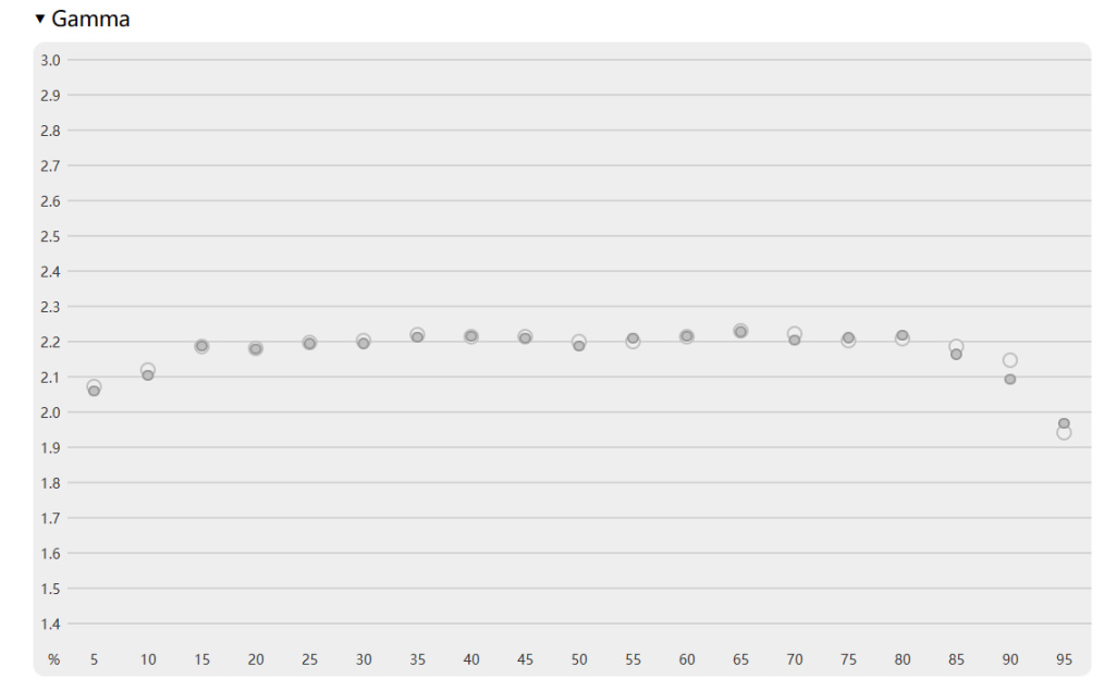 Gamma值則在15%-85%亮度之間比較平均,最大亮度下則有點飄忽: