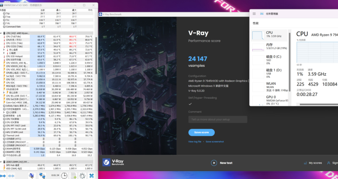 在更考驗多核性能的V-ray 5 benchmark渲染測試中,這顆7945HX3D取得了24147的成績,而i9-13980HX的分數在16000上下,領先8000多分,大緩存對這列渲染類的軟件加成還是很可觀的: