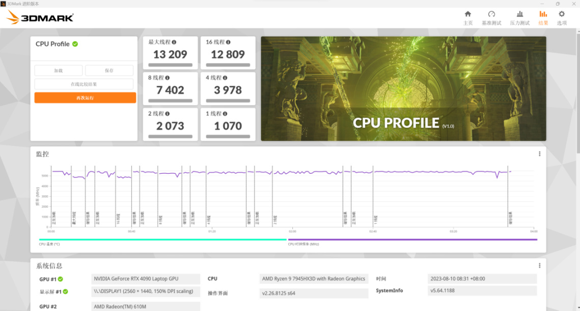 在3D Mark的CPU Profile跑分測試中,這顆CPU取得了最大線程13209的成績: