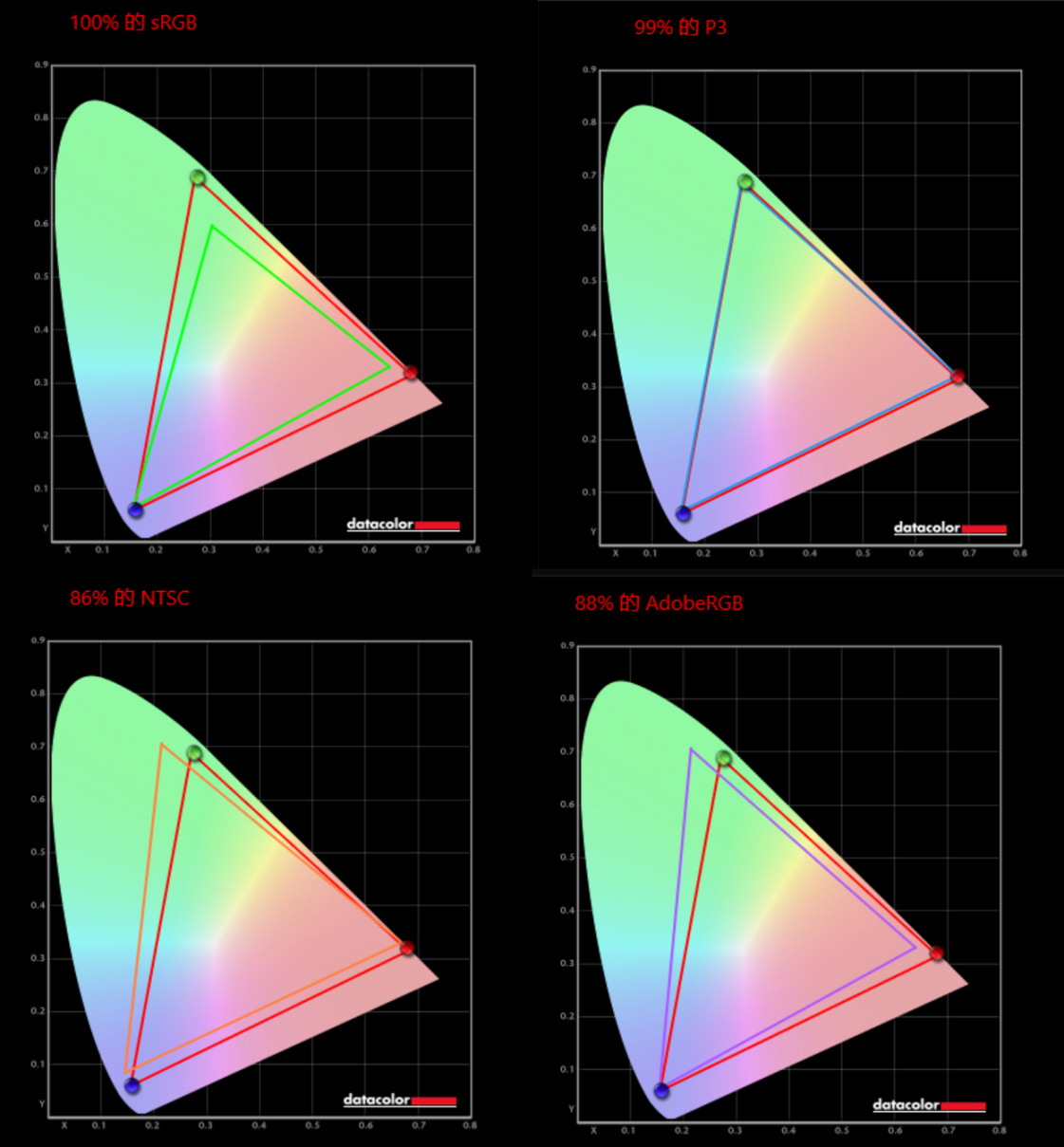 機器搭載了一塊17.3英寸 16:9的2560*1440 分辨率屏幕,擁有100%DCI-P3分辨率,240Hz刷新率以及3ms左右響應時間。並且支持杜比視界,面板來自京東方,17寸的16:9來說的話會擁有不錯的影音娛樂體驗,經過實測,屏幕色域覆蓋爲99%的P3以及86%的NTSC和88%的ARGB:
