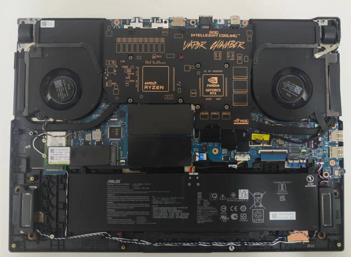 機器搭載的增強版冰川散熱架構2.0採用雙風扇+4出風口的設計,另外還有一塊超大的均熱板,加上本來的液金散熱,壓住這顆“最強芯”和移動端最強的4090顯卡問題不大。第二個硬盤擴展位被放在了電池左側,不過這裏提醒一下自行拆機不要大力出奇跡,D殼上的U型燈帶有兩個連接在主板上的排線,大力掀蓋容易翻車。