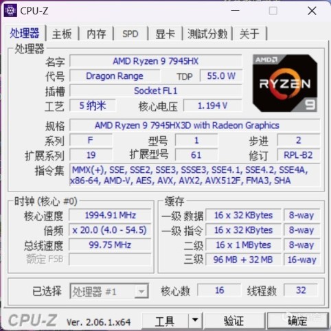 CPU-Z识别的还是R9 7945HX,问题不大,但是下面规格识别到位了,可以看到三缓96+32=128MB