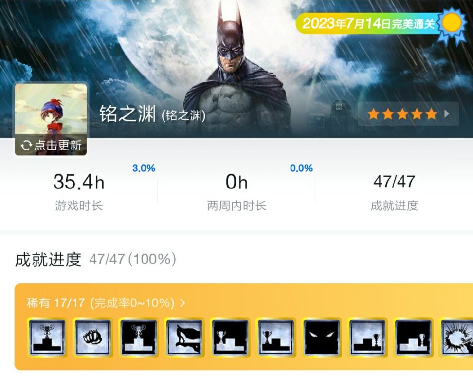 这也是我近期通关的一个全成就游戏,作为蝙蝠侠三部曲的第一部作品,虽然不像后面两部开放世界,而是线性的关卡制,但也有着十分优秀的关卡设计,游戏的打击感拳拳到肉,加上蝙蝠侠防反机制,即使你不是DC或者蝙蝠侠的粉丝,第一次体验这游戏也依旧能让你眼前一亮,其实疯人院全成就的难点并不主线任务,虽然有句话叫:谜语人滚出哥谭,但是在疯人院中其实不纯在这种情况,因为跟着主线到了后期可以找到谜语人留下的地图,会在地图上标注所有谜语人留下的问号,最难的是挑战模式的格斗部分,不靠着30~40+以上的连招,基本最后达不到三星。