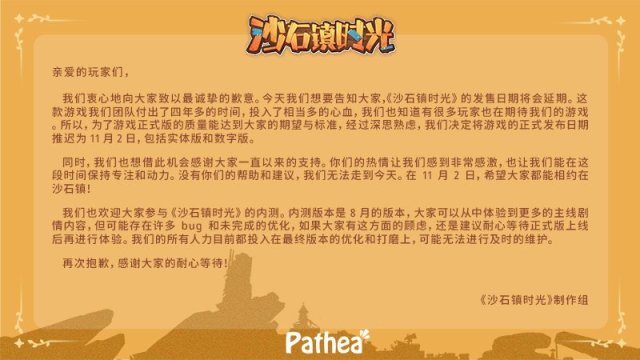 我们衷心地向大家致以最诚挚的歉意。今天我们想要告知大家,《沙石镇时光》的发售日期将会延期。这款游戏我们团队付出了四年多的时间,投入了相当多的心血,我们也知道有很多玩家也在期待我们的游戏。所以,为了游戏正式版的质量能达到大家的期望与标准,经过深思熟虑,我们决定将游戏的正式发布日期推迟为11月2日,包括实体版和数字版。