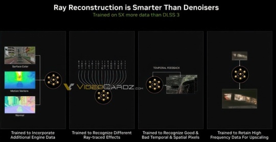 NVIDIA還宣稱,DLSS 3.5光纖重建的數據訓練量,是DLSS 3的多達5倍,而且融合了更多的傳統遊戲與遊戲引擎數據,可以識別不同的光追效果,區分時間與空間元素之間的優劣,保留高頻率使用的數據並進行縮放。