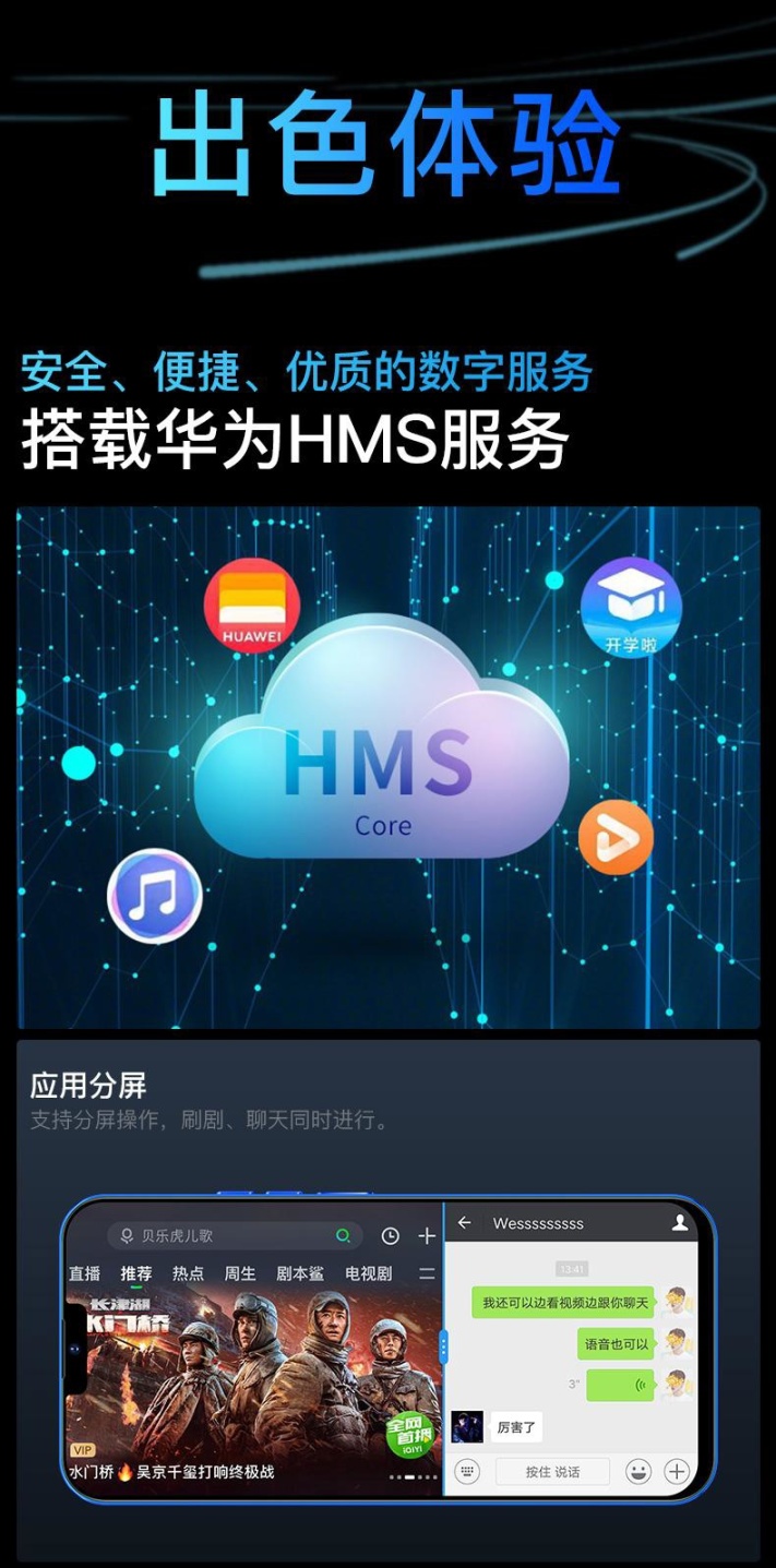 根据抖音店铺显示的商品信息,这款手机搭载了紫光展锐虎贲 T610 芯片,支持 4G 全网通,运行安卓系统,搭载华为 HMS 服务,采用 6.5 英寸刘海屏,直角机身设计,全系 AG 磨砂工艺。