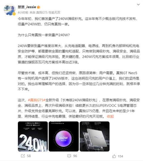 realme中国区营销总监“楚楚_Jessie”表示,今年年初,真我首发量产240W满级秒充,这半年有不少概念版闪充技术发布,但量产240W的仍只有真我一家。240W闪充方案成本很高,比目前行业普遍的旗舰百瓦闪充方案成本高出近3倍。