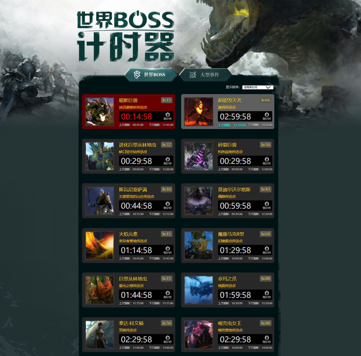 世界BOSS有固定刷新时间,可通过星岬岛BOSS计时器查看刷新时间,多数BOSS需要完成地图的团队前置事件后BOSS才会出现。