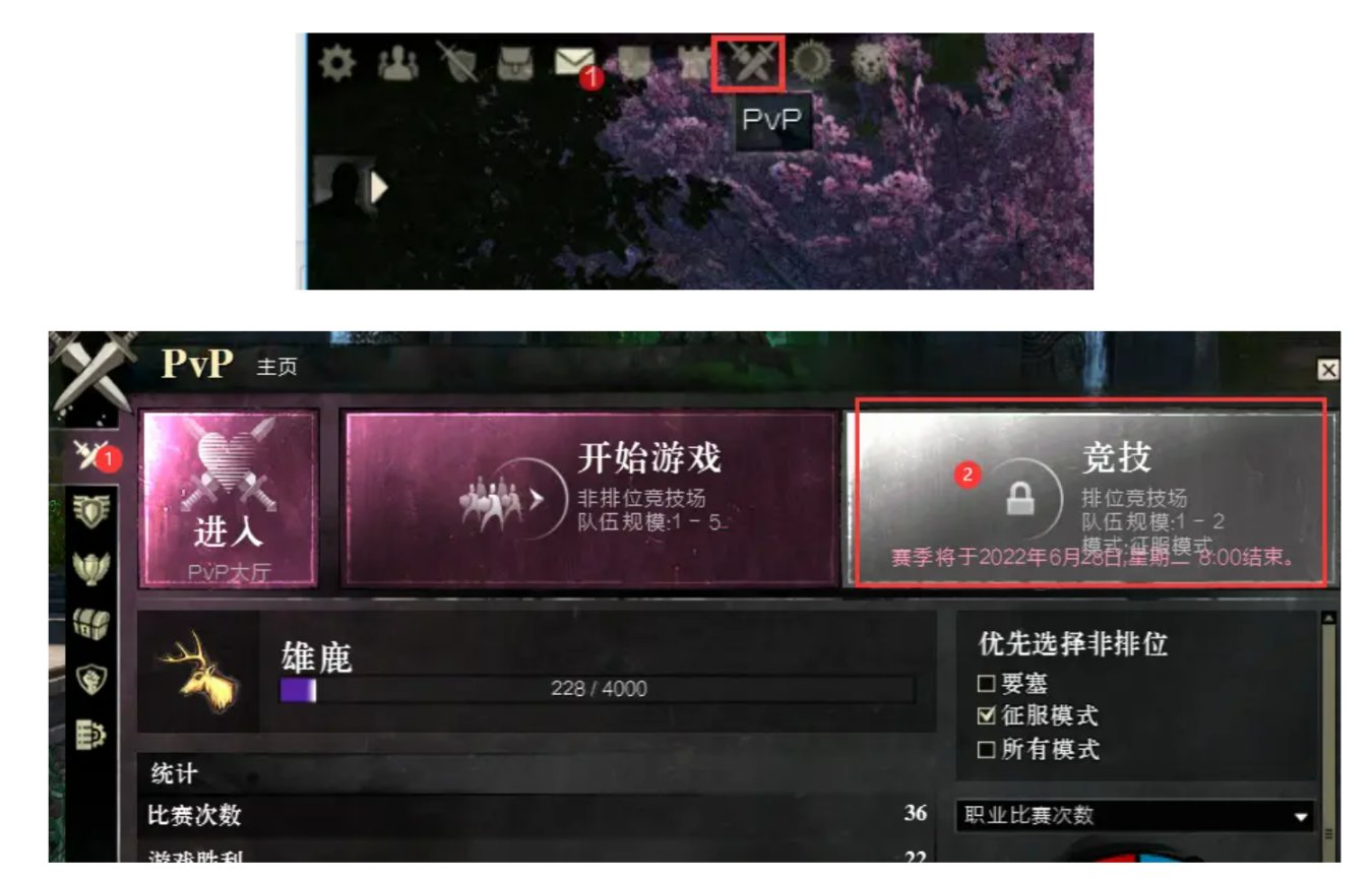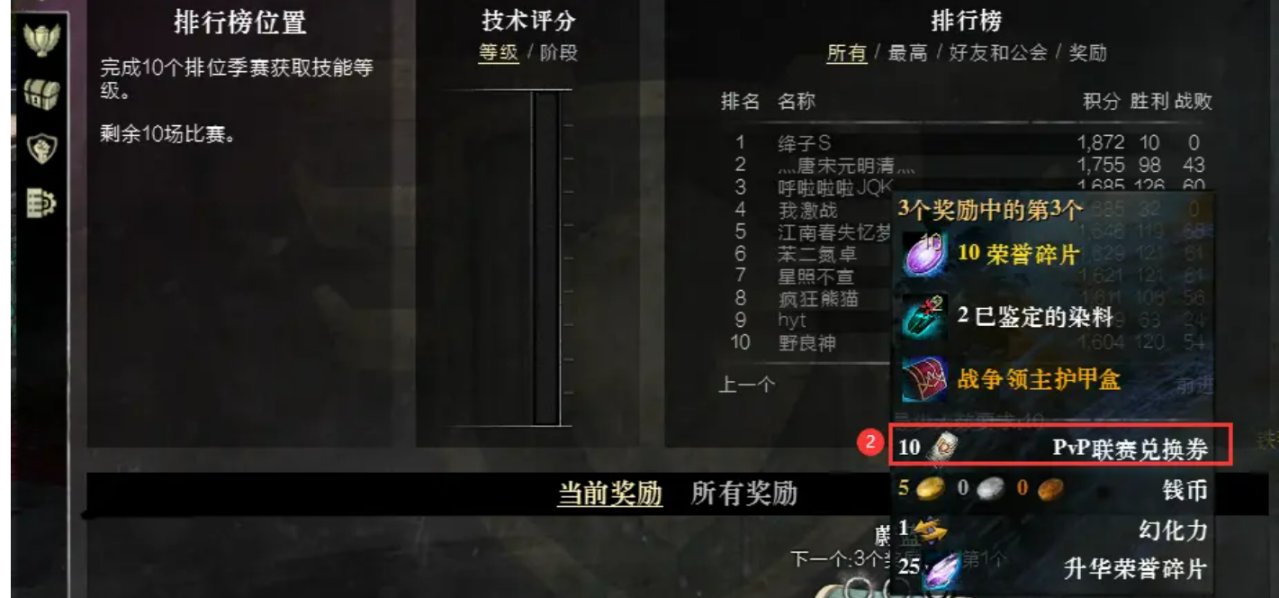 游戏左上角如图位置按钮,点击可开启PVP界面,当PVP等级达到20级后可参与联赛,联赛奖励宝箱内包含PVP联赛兑换券。
