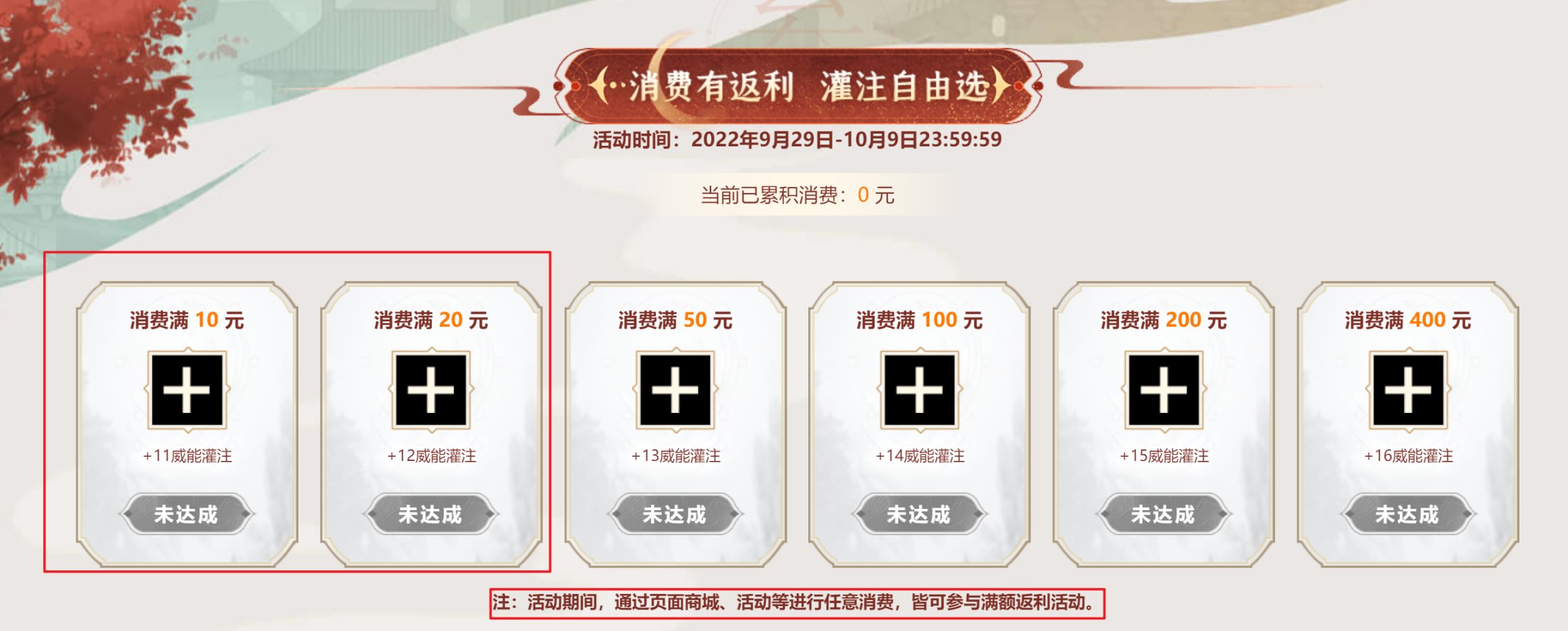 本期的消费返利内容,活动期间,通过页面商城、活动等进行任意消费,皆可参与满额返利活动!
