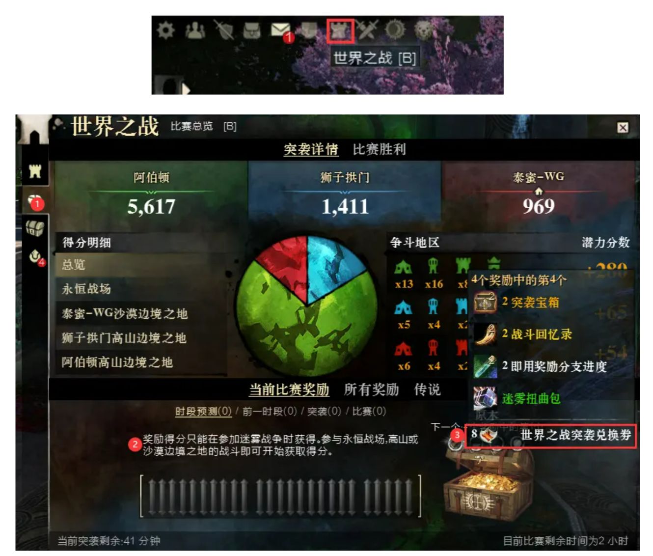 游戏左上角如图位置按钮,点击可开启WVW界面,参与如图世界之战突袭获取积分,开启宝箱后即可获得对应奖励道具。
