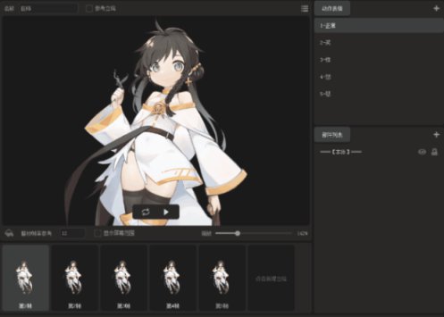 编辑器支持对同一个角色的动作、表情、部件的序列帧图进行统一管理。 行走图支持多种方向模式:分别为1/2/3/4/5/8方向模式,其中1/3/5方向模式可支持游戏中自动水平翻转。 编辑中支持K帧,每一帧动作都可以调整该帧图的位置、尺寸等相关属性。 行走图支持绑定辅助体,以便用于辅助计算(比如用于碰撞检测、打击判定)。 简洁的部件功能可快速实现游戏内的换装功能。 导入的图片素材支持单张图和规定规格的整张序列帧图片切割,编辑器还内置了合图工具,方便零碎素材的归纳整理。