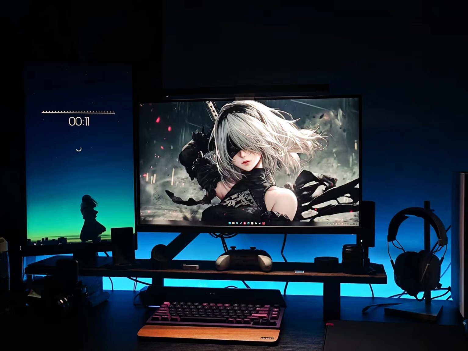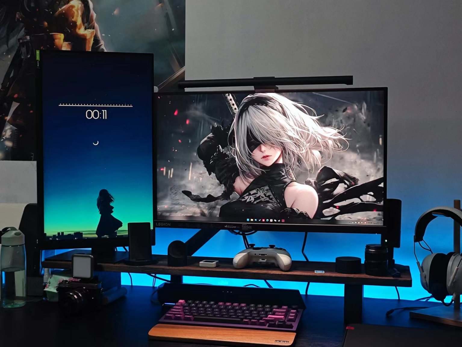 右边的横屏是最近新入手的联想 Y27Q-30 2K 165hz,目前做主屏用。挂灯是小米的1s,很久之前就在用了。联想的这块背面上了一个不知名小厂的屏幕支架,闲鱼收的。