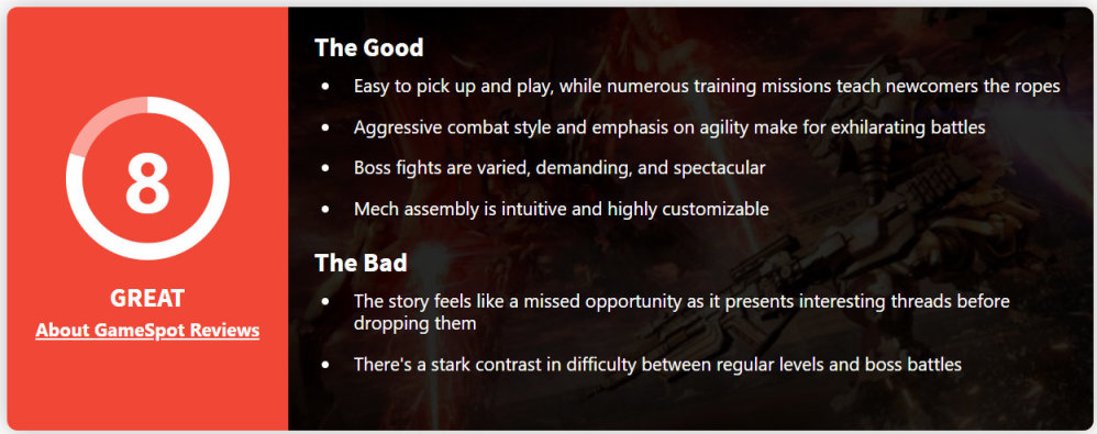 《装甲核心6 境界天火》并非一款能让机甲动作游戏重现辉煌的作品,但它确实有对这个类型进行升级、改进与打磨。出色的任务设计、激烈的Boss战、种类繁多的武器与足以极大程度影响机体性能的部件,还有精彩的火爆战斗,都让每次出击变成了令人满意的战斗谜题。虽然通过任务简报与无线电讲述的游戏剧情比较枯燥乏味,但本作依旧称得上是经典机甲游戏系列的回归之作,值得玩家欢迎。