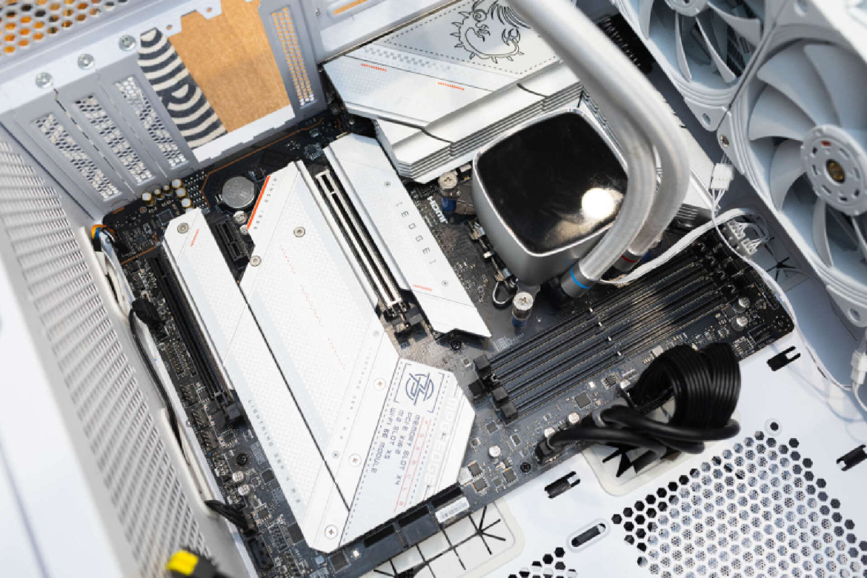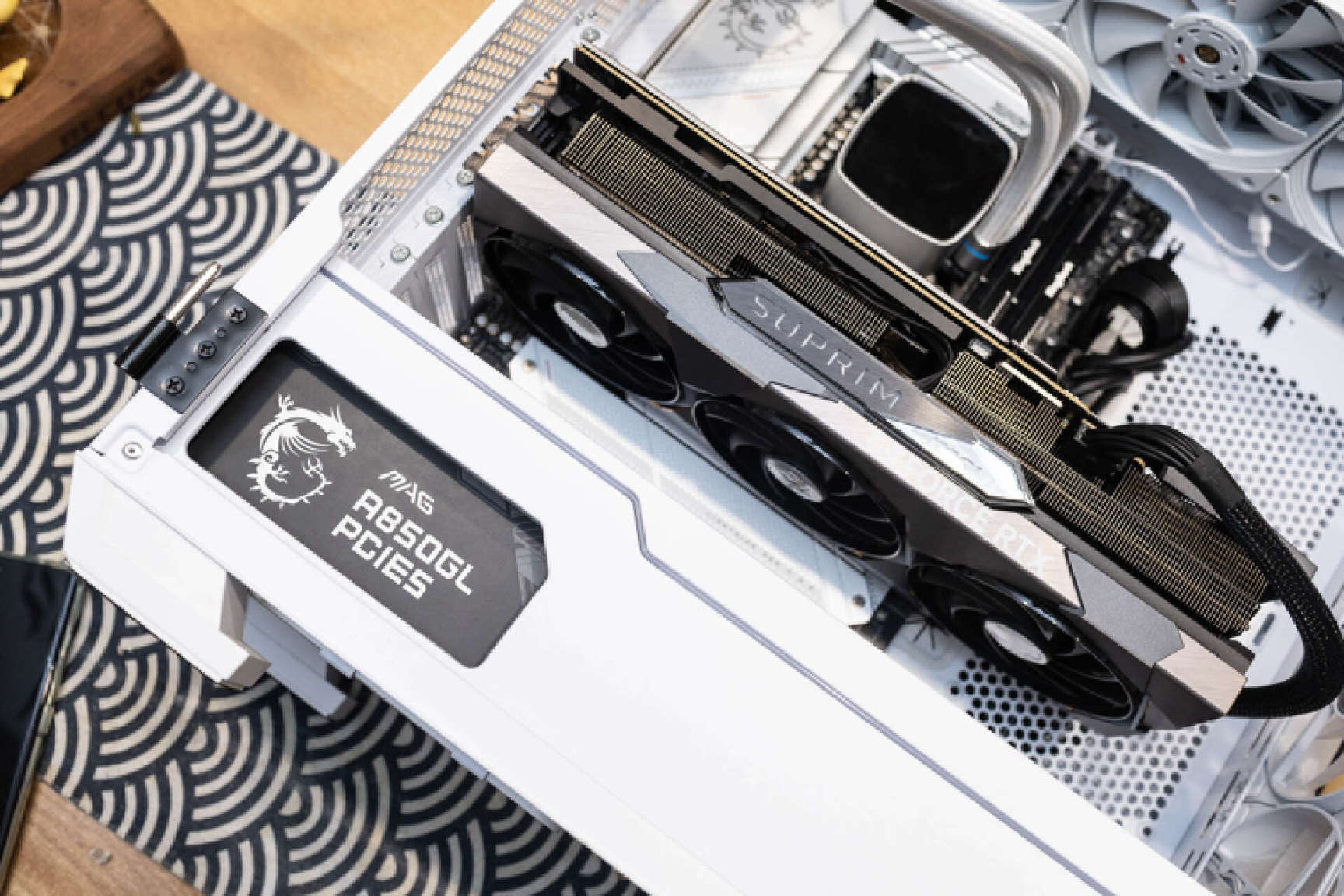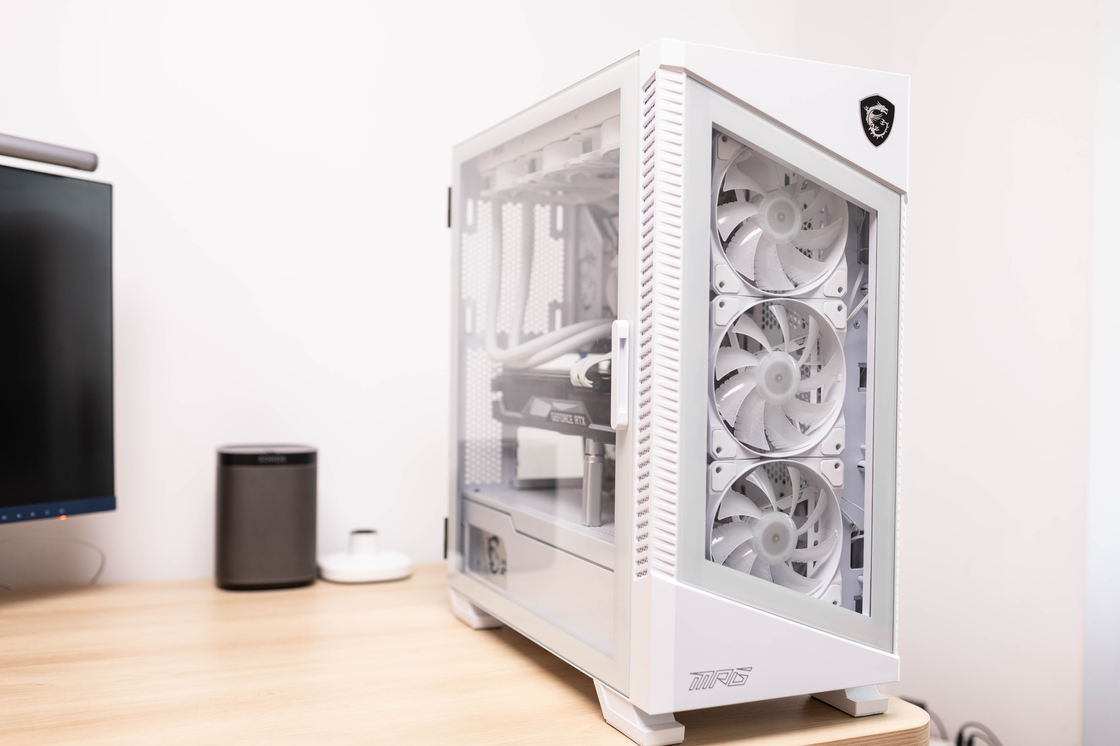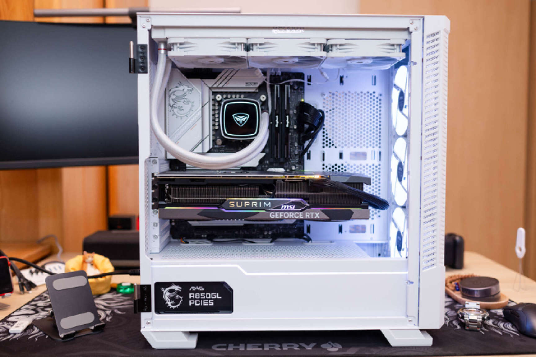 我這臺主機使用的是微星的刀鋒100R機箱,中塔空間,散熱優化也不錯,關鍵顏值也能打。機箱正面的菱形透視面板和底部的支撐腳具有識別度,機身整體的線條也比較簡潔,加上目前流行的全白配色,視覺表現還是相當不俗。