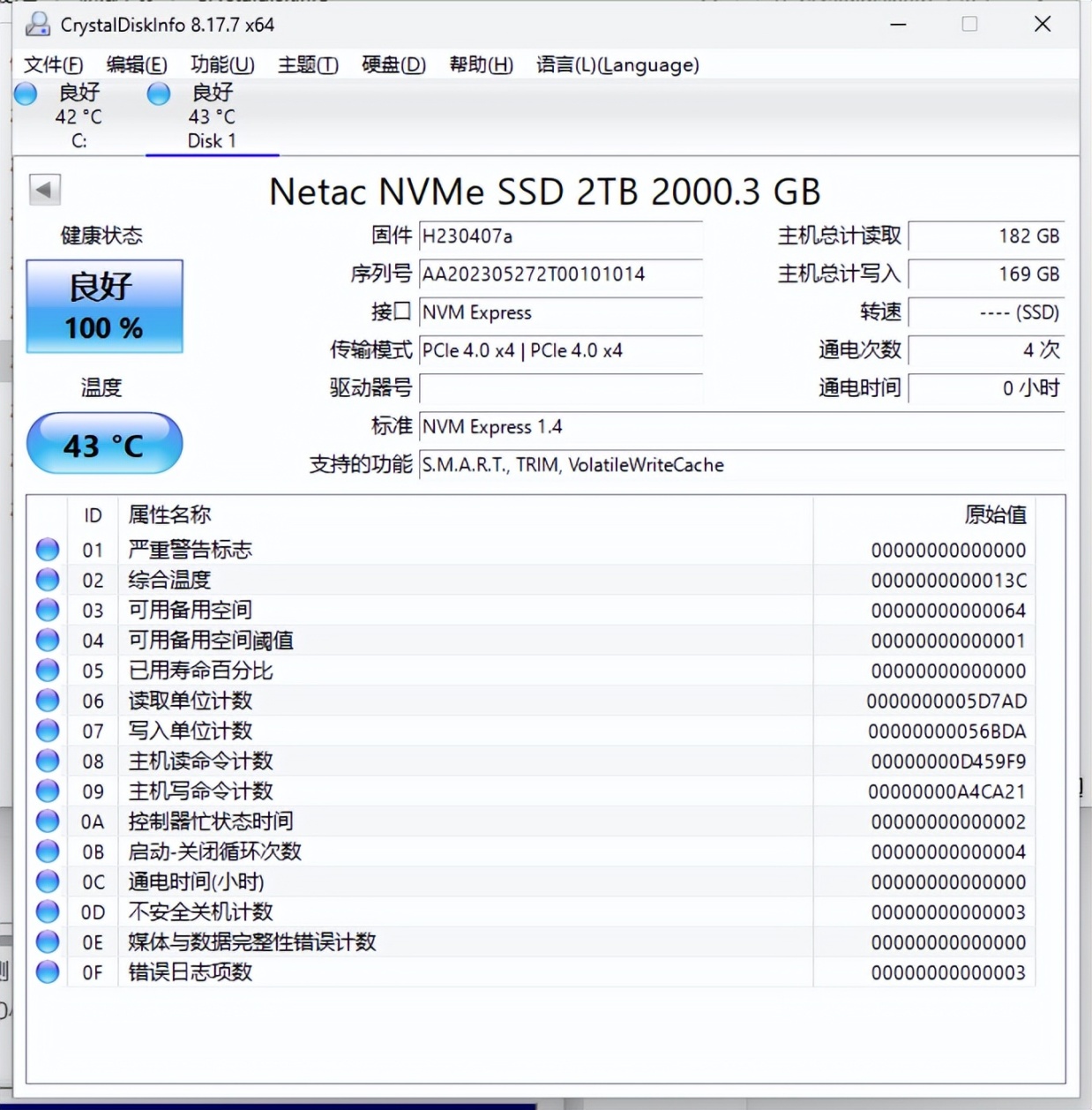 首次開機,我通過CrystalDiskInfo檢測,可以識別Netac NVMe SSD 2TB。狀態欄顯示新硬盤目前通電次數4、通電時間0小時,成色完美。室內環境28攝氏度的情況下,開機溫度43攝氏度。硬盤支持NVME1.4,傳輸模式PCIe 4.0*4。