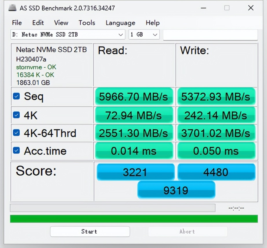 在AS SSD BenchMark的跑分中,這塊NV7000-t 2TB硬盤獲得了9319分的好成績,2TB的大容量應該提供很大的幫助。