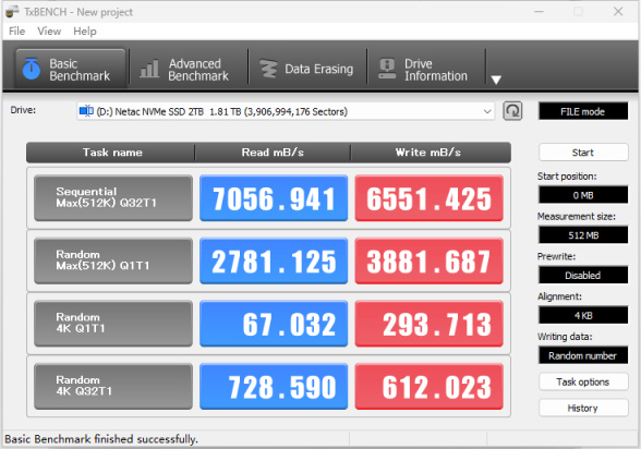 在TxBench測試中,這塊2TB固態硬盤512K大文件讀寫速度爲7056MB/s、6551.42MB/s,4K小文件隨機讀寫速度67.09MB/s、293.47MB/s。不僅讀取速度符合官方標稱,寫入速度甚至還略高於同級產品。