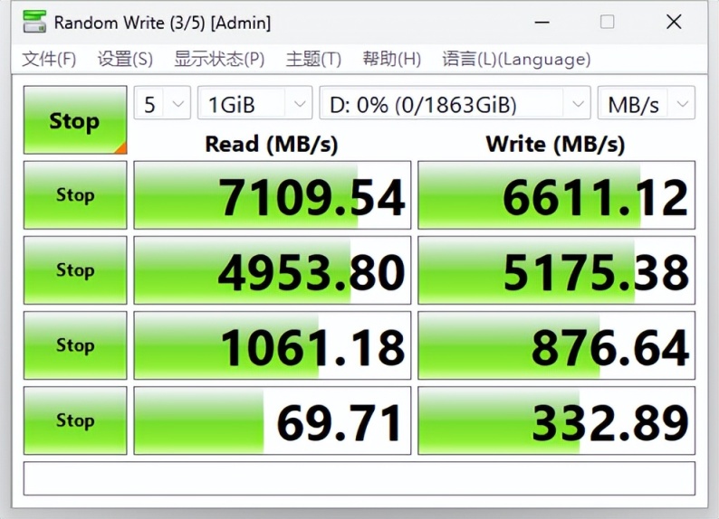 使用CrystalDiskMark對NV7000-t 2TB這塊固態硬盤進行簡單的性能測試。默認設置下,最大讀取速度達到了7109MB/s,最大寫入速度達到了6611MB/s,4K運行讀寫性能也達到了69.71MB/s和332.89MB/s,表現相當令人滿意。由於搭載HMB及SLC Cache緩存技術,硬盤的I/O性能也大幅提升,可以更加流暢讀寫加載,避免掉速卡頓的情況。