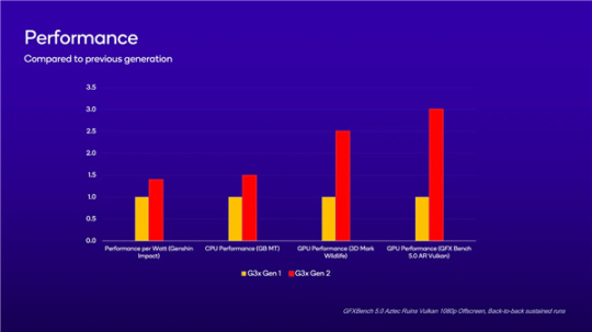 首先來看驍龍G3x Gen2,其CPU是8核Kyro架構,GPU使用了新的命名方式,叫做A32,詳細的頻率等規格都沒給出,號稱是CPU提升30%以上,GPU性能翻倍。