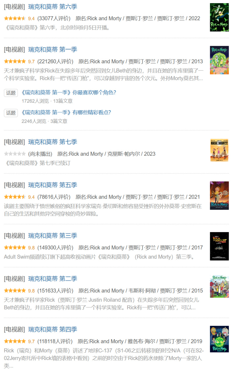 就目前的豆瓣評分來看,《瑞克與莫蒂》的評分均在9分以上!希望第七季在進行了大變動之後可以保持原有的水準吧!