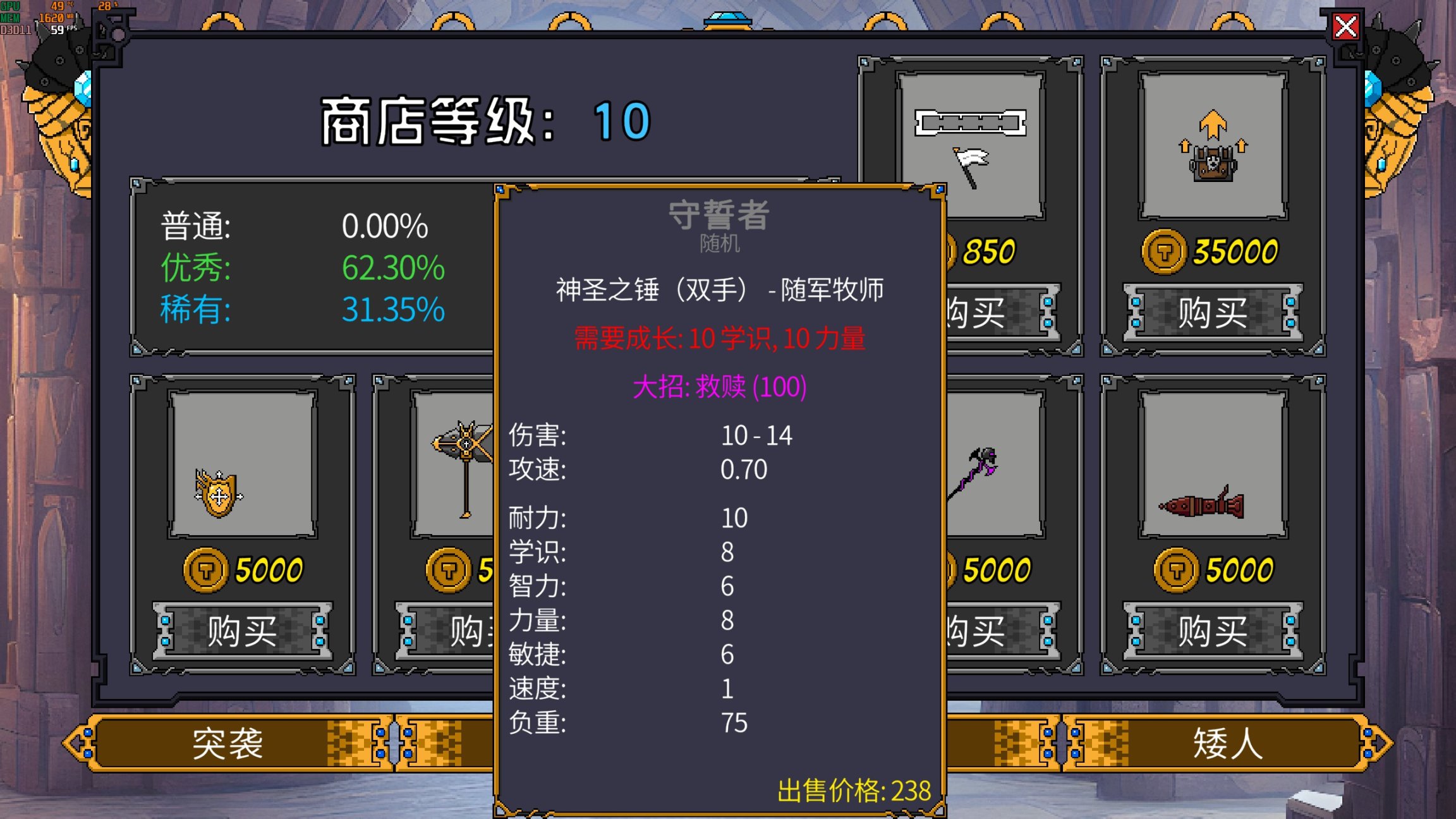 部分武器自帶主動或被動技能,例如“壁壘盾”主動技能“盾牆”,“狂怒之功”主動技能“箭術”可一次性射出七支弓箭,“刺客匕首”被動技能“毒刃”。每隔十波戰鬥,商店便會刷新三選一的神器,神器擁有強大的效果,例如“護身符”增加元素傷害抗性並在受到致命傷害時獲得“免疫效果”,“金礦石”增加負重並在升級時獲得金幣。
