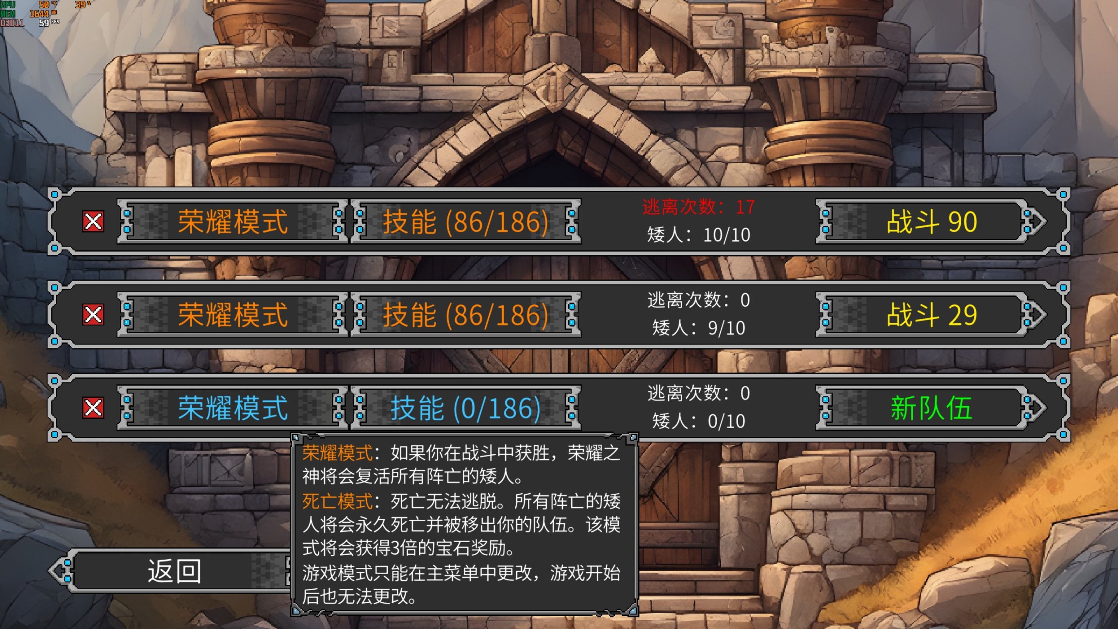 普通職業升級時只會增加一點某一屬性,例如盜賊+敏捷,牧師+學識。但是,進階職業升級時,某兩種屬性各增加一點,術士+智力和敏捷,聖騎士+耐力和學識。遊戲提供了兩種模式供玩家選擇,“榮耀模式”:在戰鬥中獲勝,陣亡的矮人會復活;“死亡模式”,戰鬥中所有陣亡的矮人將永久死亡,但會獲得3倍寶石獎勵。