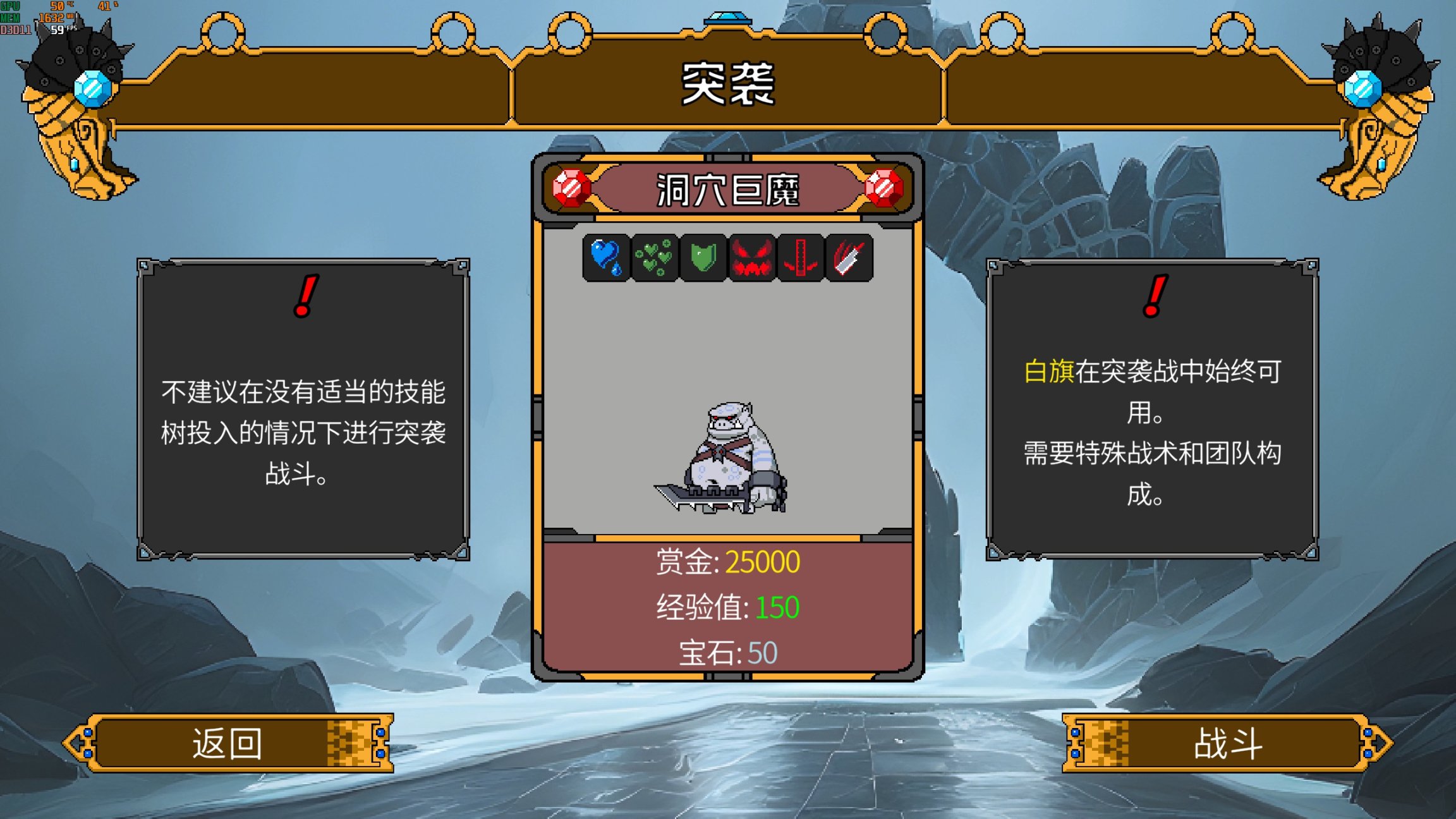在一定回合數後,遊戲將解鎖突襲模式,出現單體BOSS,例如“洞穴巨魔”,擁有強大的屬性和主被動技能。玩家需要根據BOSS的特性來選擇團隊構成,“洞穴巨魔”免疫冰凍,因此不上場冰系法師。在戰鬥過程中,技能往往會附帶“鼓舞”“醉酒”等增益或者“灼燒”“流血”減益效果。BOSS戰鬥高風險的同時,往往會給玩家帶來巨大的受益,高額的賞金、經驗值和寶石。