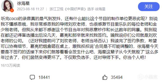 她表示当时自己被节目组的工作人员威胁,被节目组骗了签下合同,不过在接下来的几年里,徐海星始终遭受着节目组对她恶意炒作和长达数年的网暴。