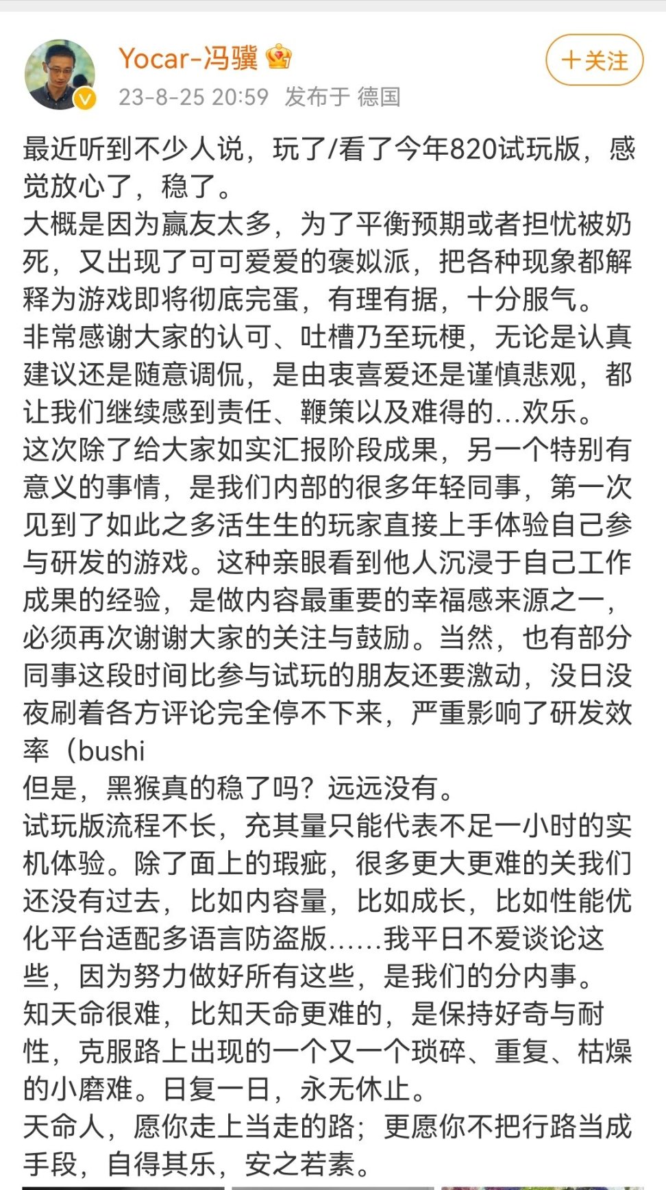 《游戏科学》创始人,《黑神话悟空》主创之一的冯骥发布微博长文表示:悟空还远没有稳。