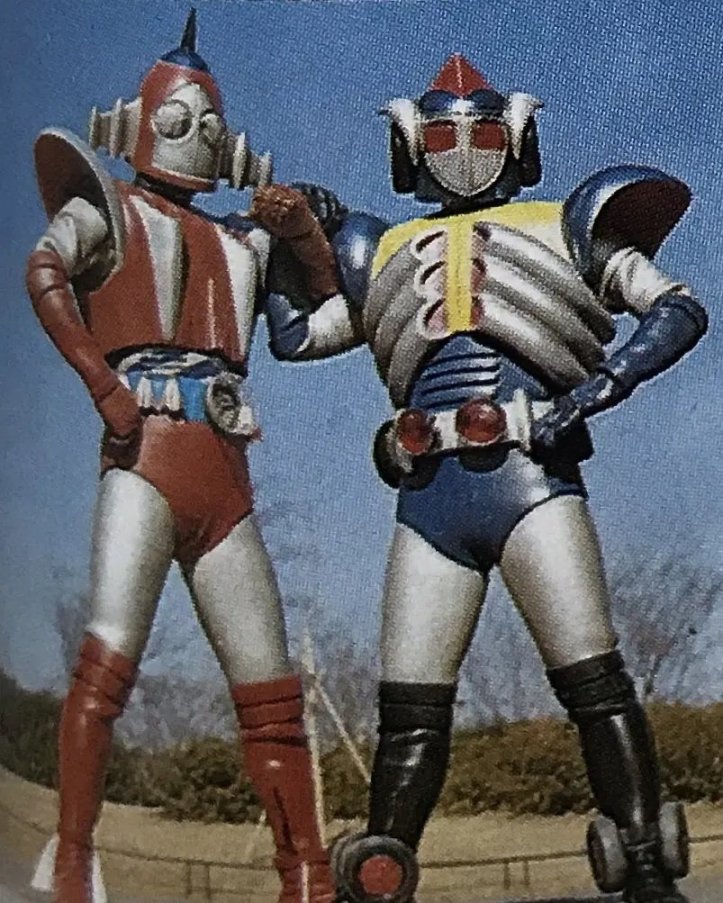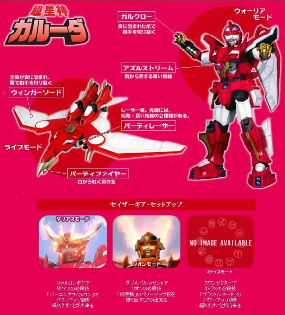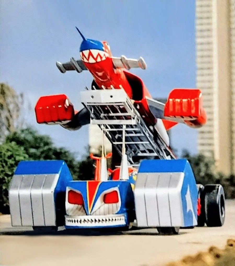 他有人分别和汽车或飞机合体变身的形态,按理说应该会是机器人,可是他却长得很像奥特曼。而他的攻击方式呢还有从身体里发射导弹,总之呢是一部很另类的特摄