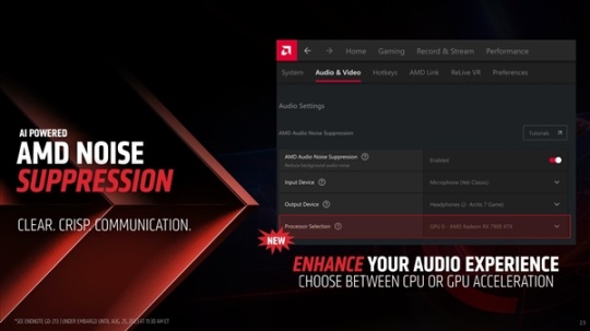 最后,AMD驱动还会加入新的音频降噪功能,可以选择使用CPU处理器或者GPU显卡进行加速,降低音频噪音,提升清晰度。