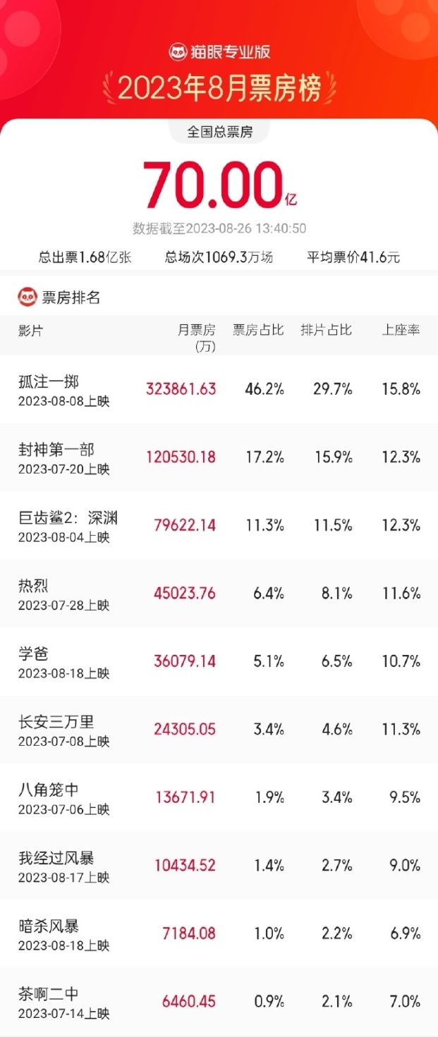 根据第三方数据平台猫眼专业版的数据:8月26日13时40分,2023年8月总票房破70亿!