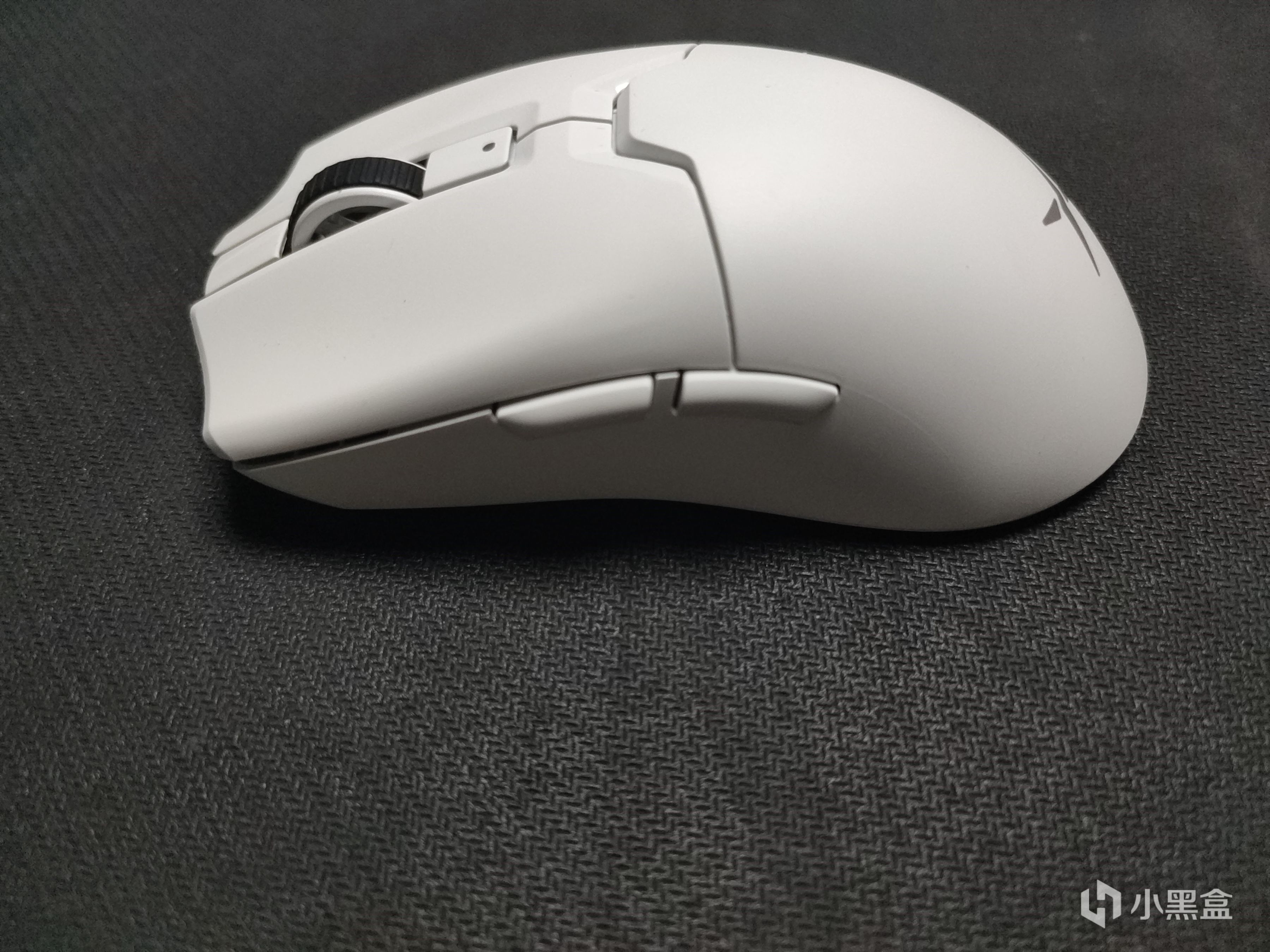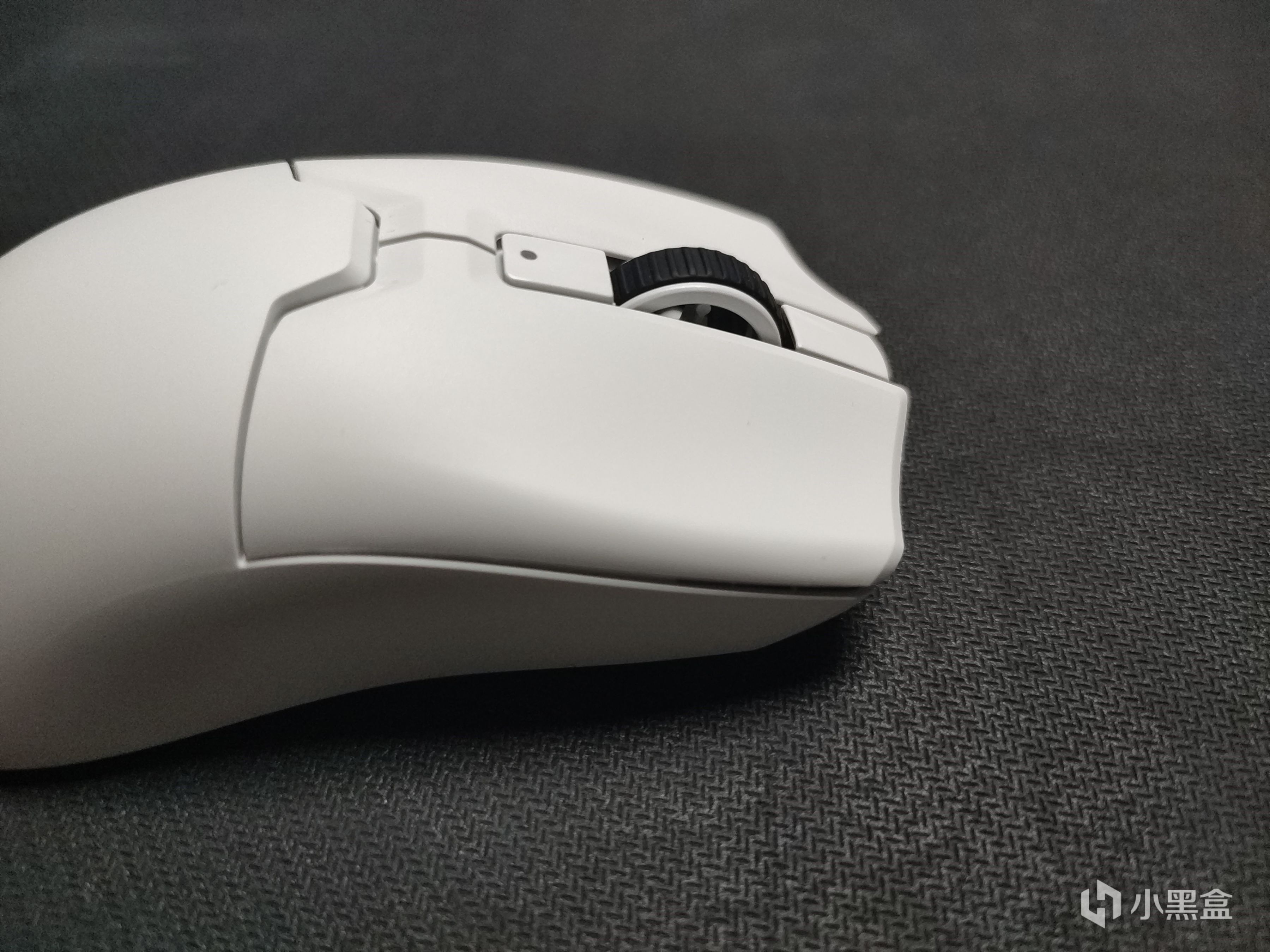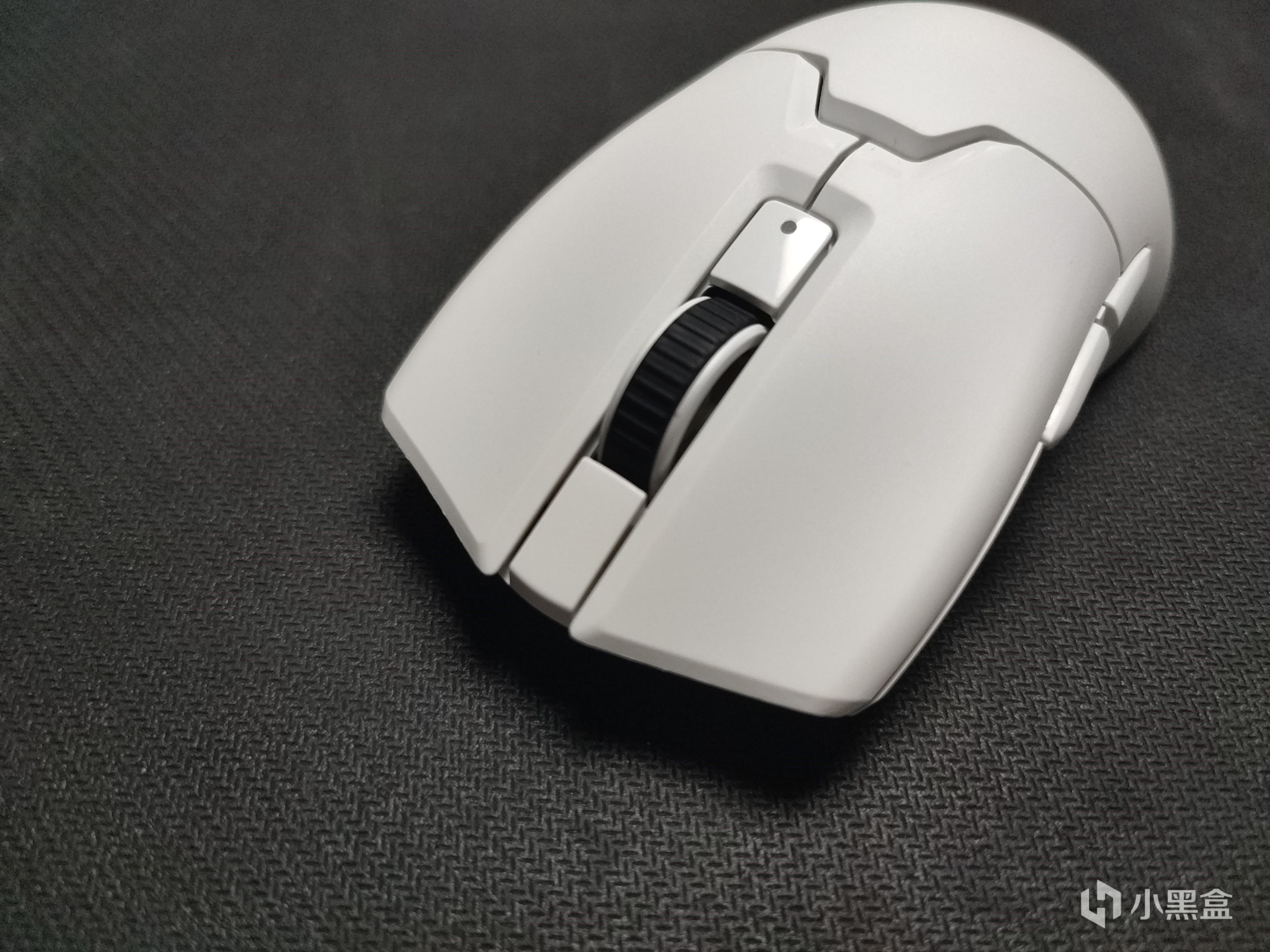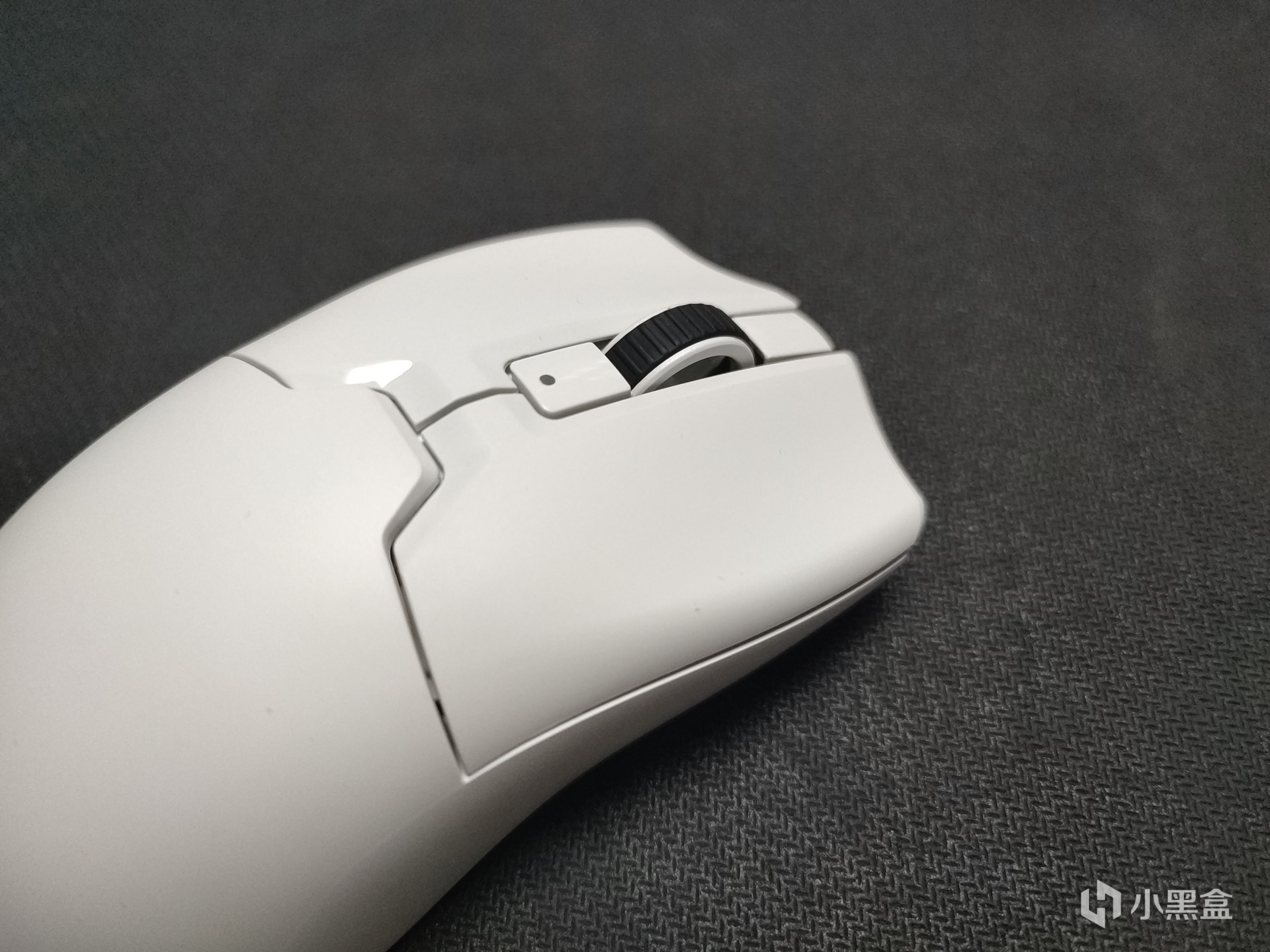 滚轮是鼠标唯一的异色部分,中间和手指接触的地方采用橡胶材质,会更加耐磨,旁边则还是白色塑料。滚轮中间则是为了减少重量,做了镂空处理,这也是目前很多轻量化鼠标的同款处理方式。