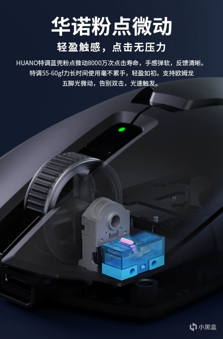 左右两个按键的微动采用的是环诺的蓝壳粉点,实际上手使用体验下来按键清脆没异响,按压压力相较于凯华的GM8.0小了很多,更适合手劲小的或者需要连续按很多次鼠标的游戏。