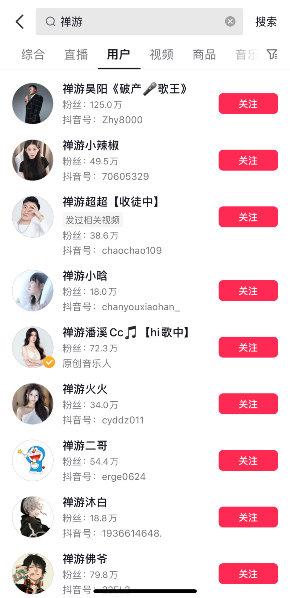 禅游与主播采用包场的签约模式,达成合作的主播会直接在名字前面加上「禅游」名号。在抖音搜索这一关键词,能够搜索到1名100w以上的主播、38名10w-100w粉丝的主播、170名1w-10w粉丝的主播,以及不计其数的1w粉丝以下的主播。此外还有一部分主播未在名字中加入禅游字样,但是也与他们达成了合作。禅游在7月发布的信息显示,他们已掌握着近千人的签约主播团队。