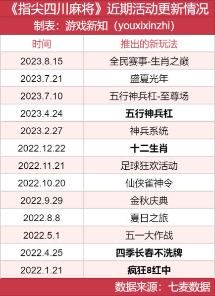 玩法也是突出爽感的相当重要的一环。禅游近几年的财务报告中,都会特别指出「旗下某某游戏推出了某某新玩法」,并将玩法方面的创新当作收入增长的重要原因之一。以《指尖四川麻将》为例,游戏新知根据七麦数据爬取到的版本更新信息,整理出了游戏2022年以来的活动更新情况。
