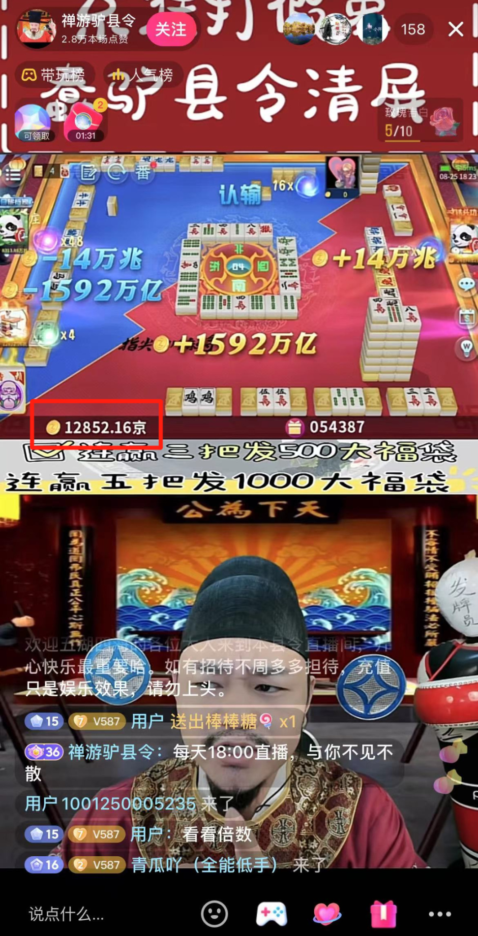 麻将和扑克这两种棋牌,本身就具有受众广泛的属性。而抖音这个同样大众化的平台,使得无论直播还是游戏的潜在用户都不会低。抖音直播间下方的「小手柄」图标则可以一键直达游戏,缩短了做出进入游戏和充值这些行为所需的路径。无论获量还是刺激消费欲望,都是主播擅长的领域。