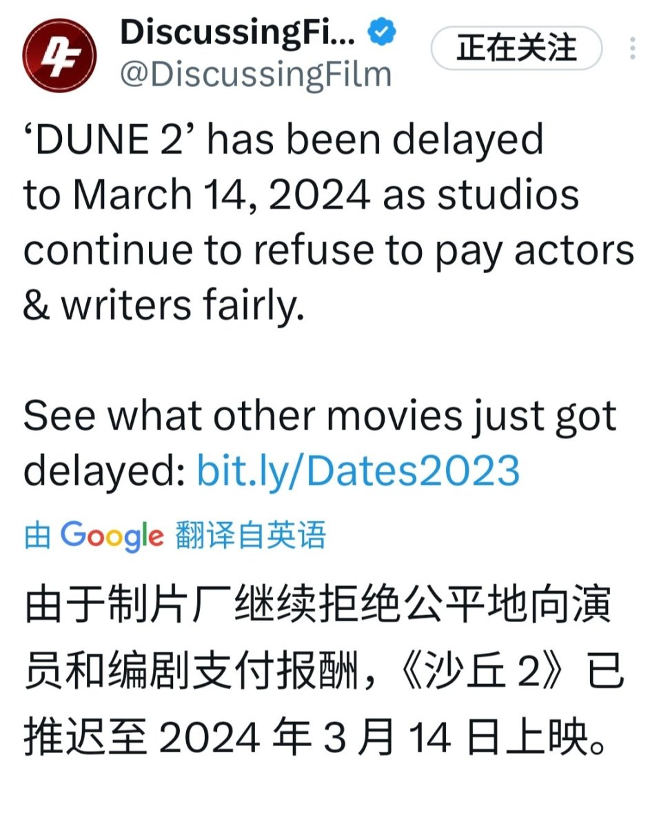 《沙丘2》是一部由丹尼斯·維倫紐瓦執導的科幻電影,改編自弗蘭克·赫伯特的同名小說,是《沙丘》的續集。該片原定於2023年11月3日在北美上映,但由於美國演員工會和美國電視交易協會正在進行罷工,導致電影的宣傳工作無法進行,華納兄弟不得不宣佈將該片推遲至2024年3月15日。