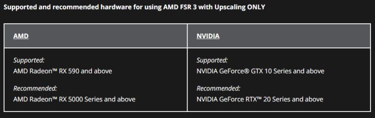FSR 3 兼容 AMD 和英伟达的显卡,AMD 确认 FSR 3 支持 Radeon RX 7000、6000 和更老的型号,推荐在 RX 6000 及更新型号上开启。并且英伟达 RTX 20 以上显卡也将支持 FSR 3,推荐 RTX 30 及更新型号!此外,AMD RX 590 和英伟达 GTX 10 系列等多款老显卡也支持 FSR 3 的部分功能,不支持最新的帧生成功能。